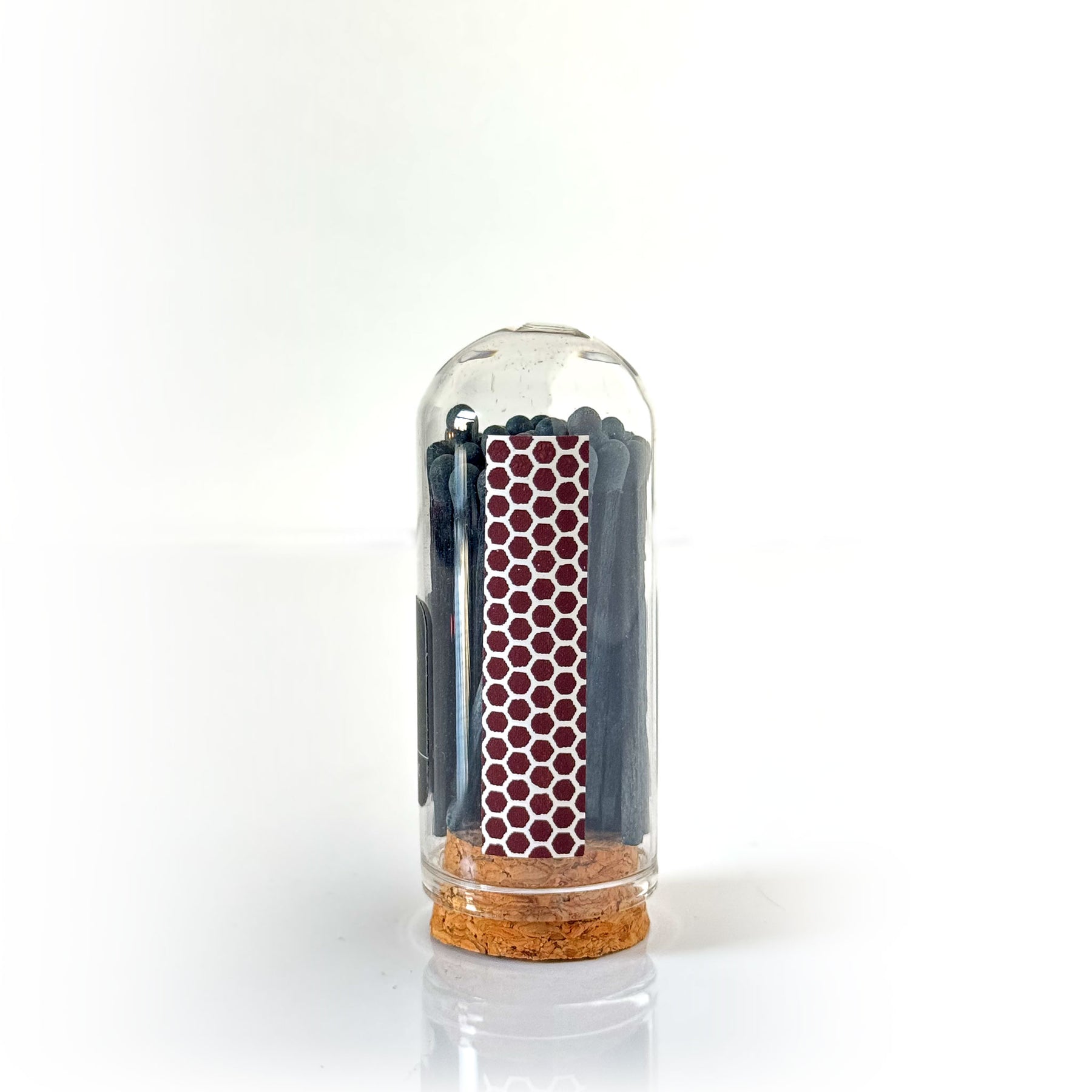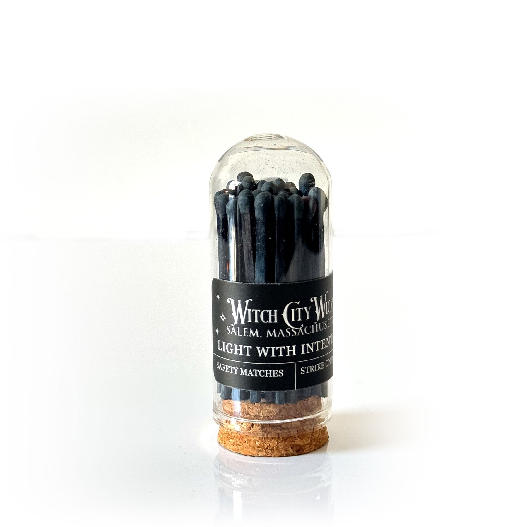 Witch City Wicks mini glass cloche match jar with 2” black tipped matches inside and striker along the side.