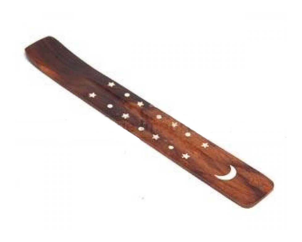 Traditional incense holder with gold moon and stars inlaid design. 10" long