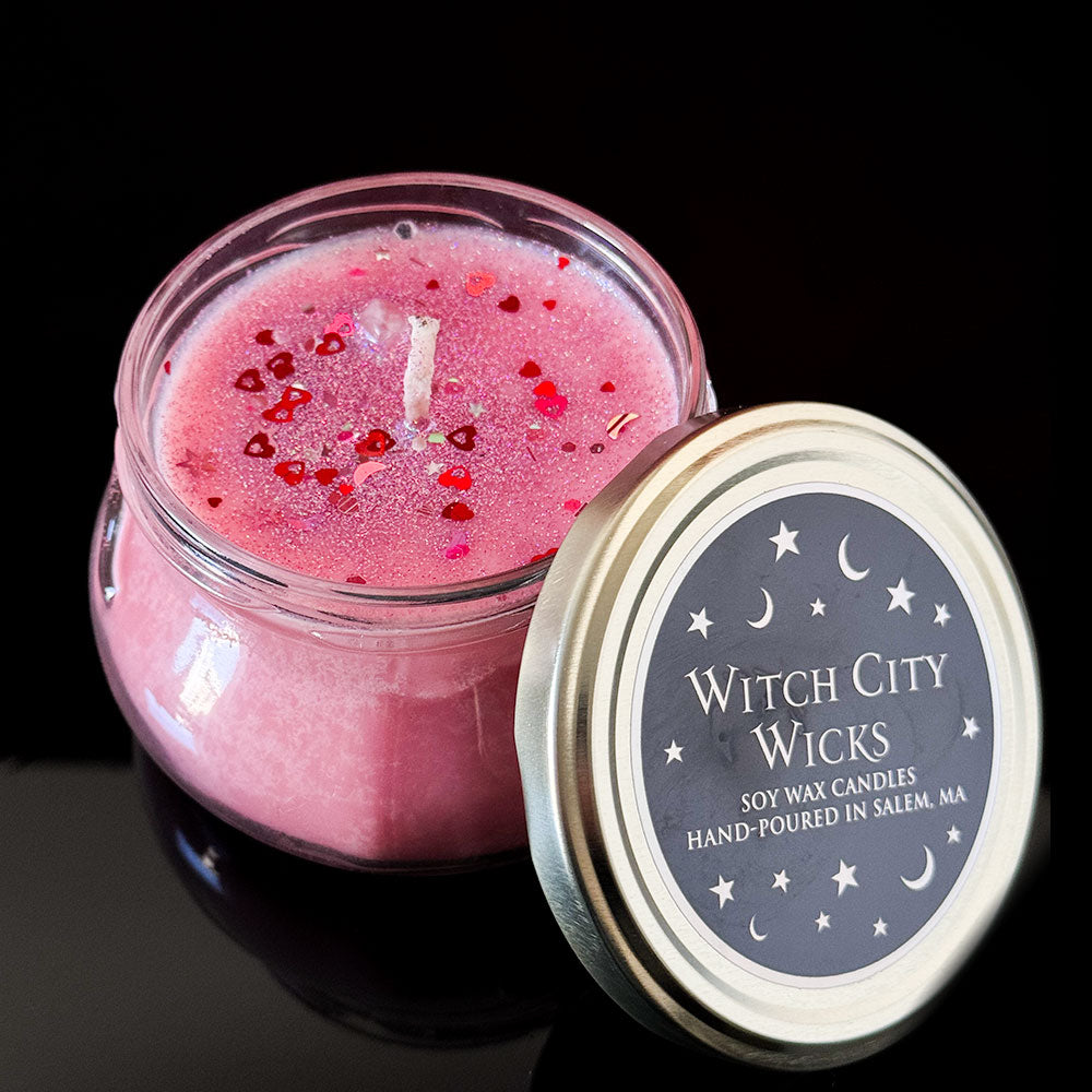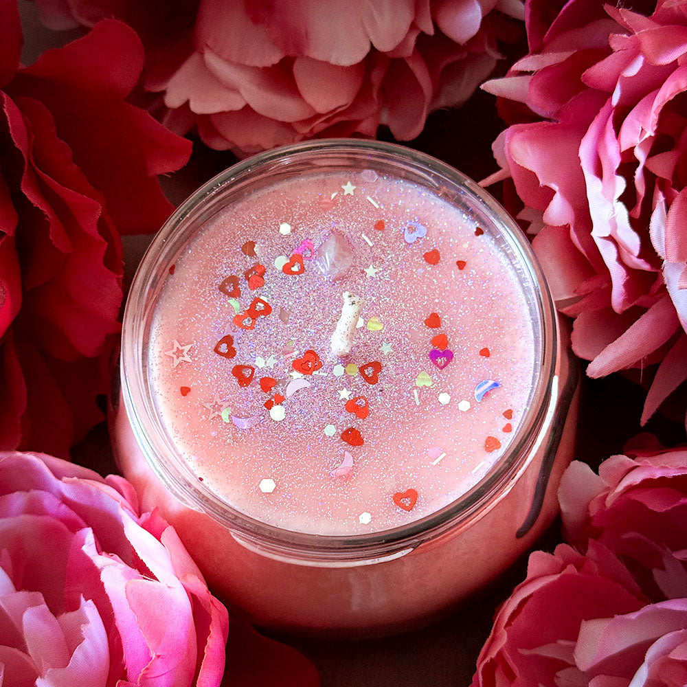 A sensual blend of warm vanilla, sandalwood, patchouli and blackberry fused with a light musk jasmine and rose. All mixed into pink soy wax and elaborately decorated with glitter and rose quartz.