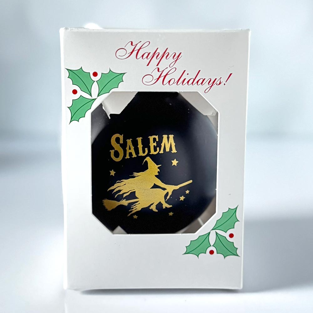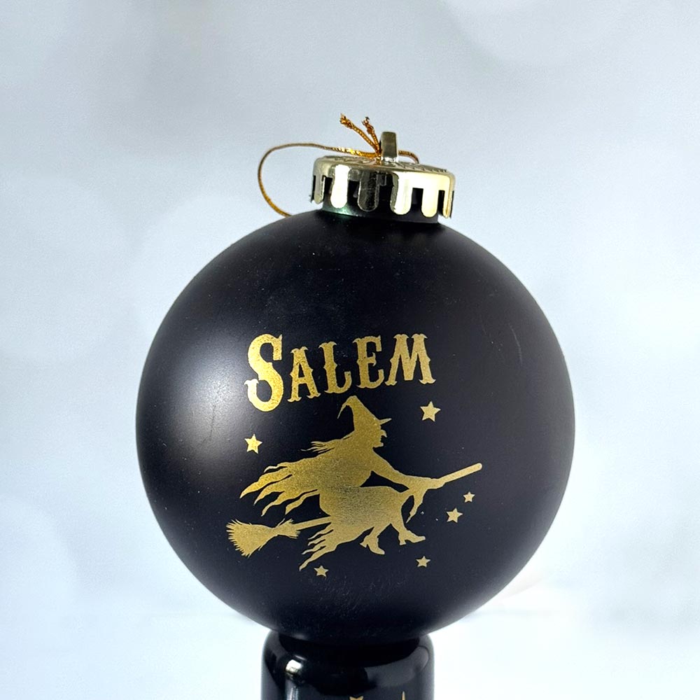 Black shatterproof satin finish ornament with gold Salem witch design with gold top and string to hang.